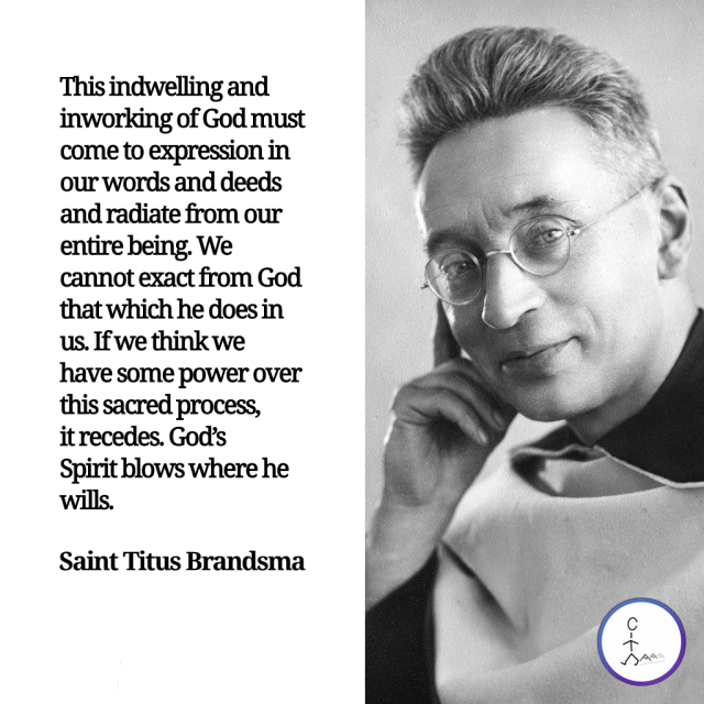 This indwelling and inworking of God must come to expression in our words and deeds and radiate from our entire being. We cannot exact from God that which he does in us. If we think we have some power over this sacred process, it recedes. God’s Spirit blows where he wills. — Saint Titus Brandsma