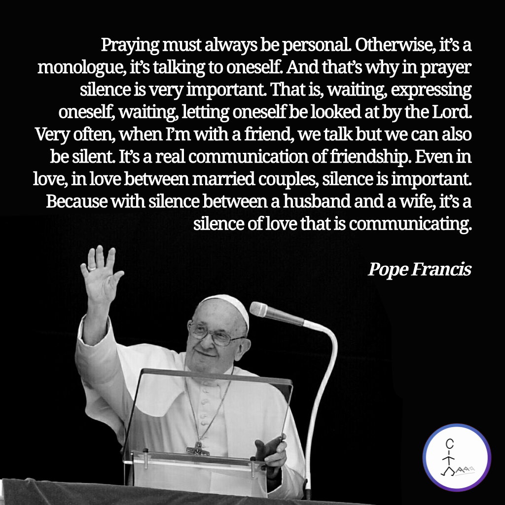 Praying must always be personal… that’s why in prayer silence is very important… Very often, when I’m with a friend, we talk but we can also be silent. It’s a real communication of friendship. Even in love… it’s a silence of love that is communicating. — Pope Francis