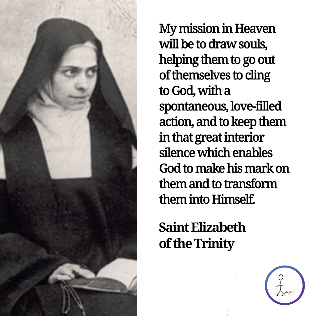 My mission in Heaven will be to draw souls, helping them to go out of themselves to cling to God, with a spontaneous, love-filled action, and to keep them in that great interior silence which enables God to make his mark on them and to transform them into Himself. — Saint Elizabeth of the Trinity