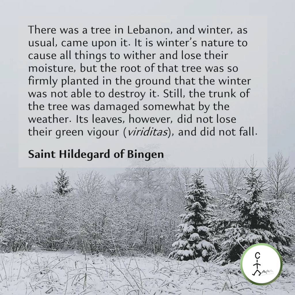 There was a tree in Lebanon, and winter, as usual, came upon it. It is winter’s nature to cause all things to wither and lose their moisture, but the root of that tree was so firmly planted in the ground that the winter was not able to destroy it. Still, the trunk of the tree was damaged somewhat by the weather. Its leaves, however, did not lose their green vigour (viriditas), and did not fall. — Saint Hildegard of Bingen
