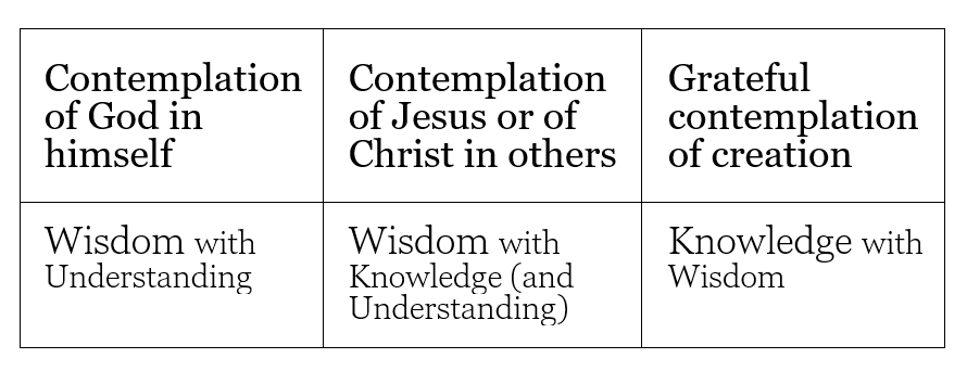 Usually, the way Christian contemplation is described accords with the Gift of Wisdom. Contemplation is a loving wisdom. It sets matters marvelously in order, like all wisdom does. Its object is God, and it is lived closeness, intimacy, with God that rearranges us and puts our desires, indeed even our thoughts, knowledge, and imaginings, in order.