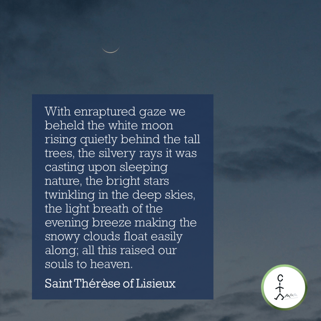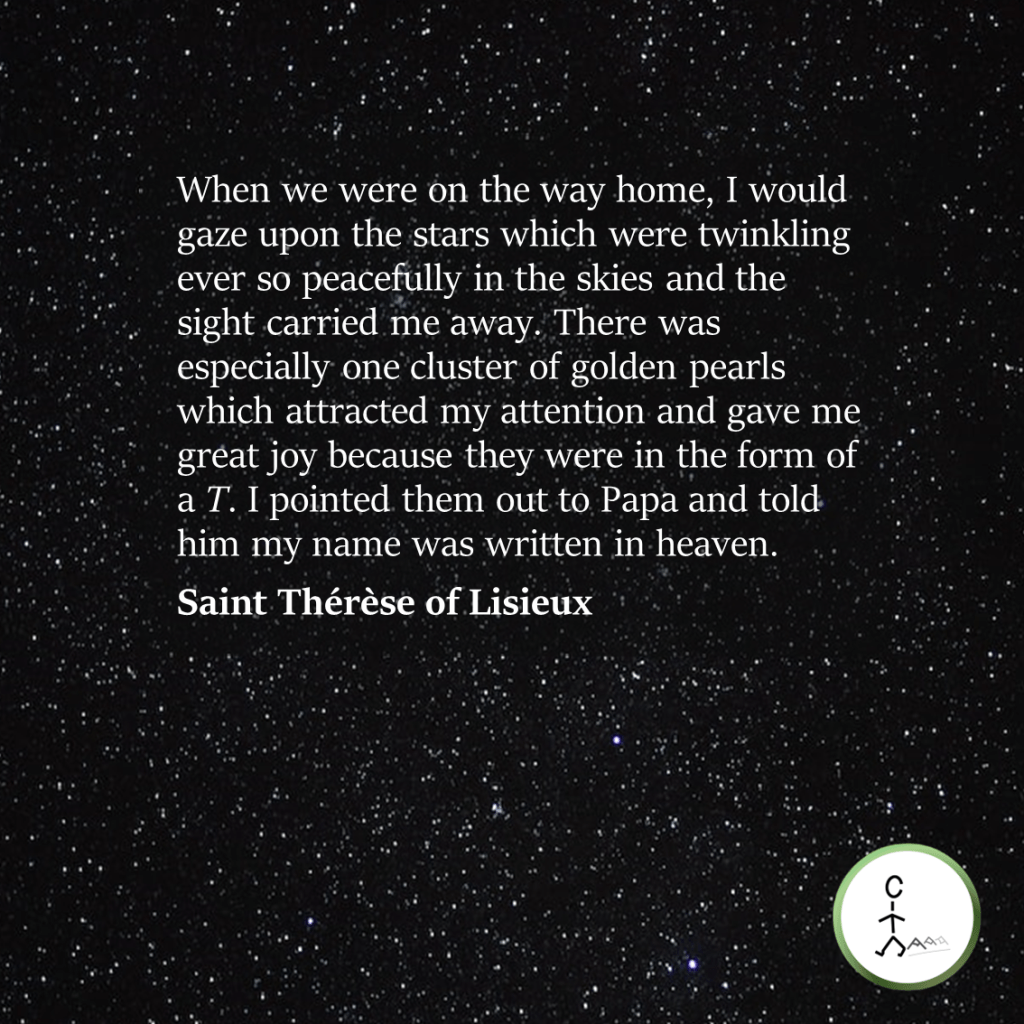 In honour of what would be her feast day to celebrate, if it did not fall on a Sunday this year, enjoy this selection of quotes from Thérèse of Lisieux—all on the theme of created nature. A couple of the quotes display the saint’s attraction to the created things of this earth, which then propel her to contemplation of their Creator. Another two show the importance of the world beyond our world. But even then, we could never appreciate the expanse of the night sky if we were to destroy our atmosphere and we can’t even now when we pollute its night skies with too much artificial light.