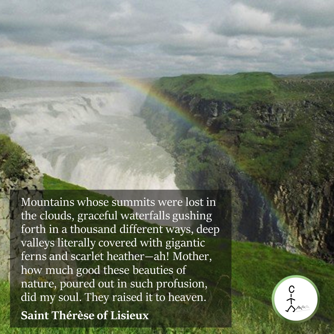 Mountains whose summits were lost in the clouds, graceful waterfalls gushing forth in a thousand different ways, deep valleys literally covered with gigantic ferns and scarlet heather—ah! Mother, how much good these beauties of nature, poured out in such profusion, did my soul. They raised it to heaven.