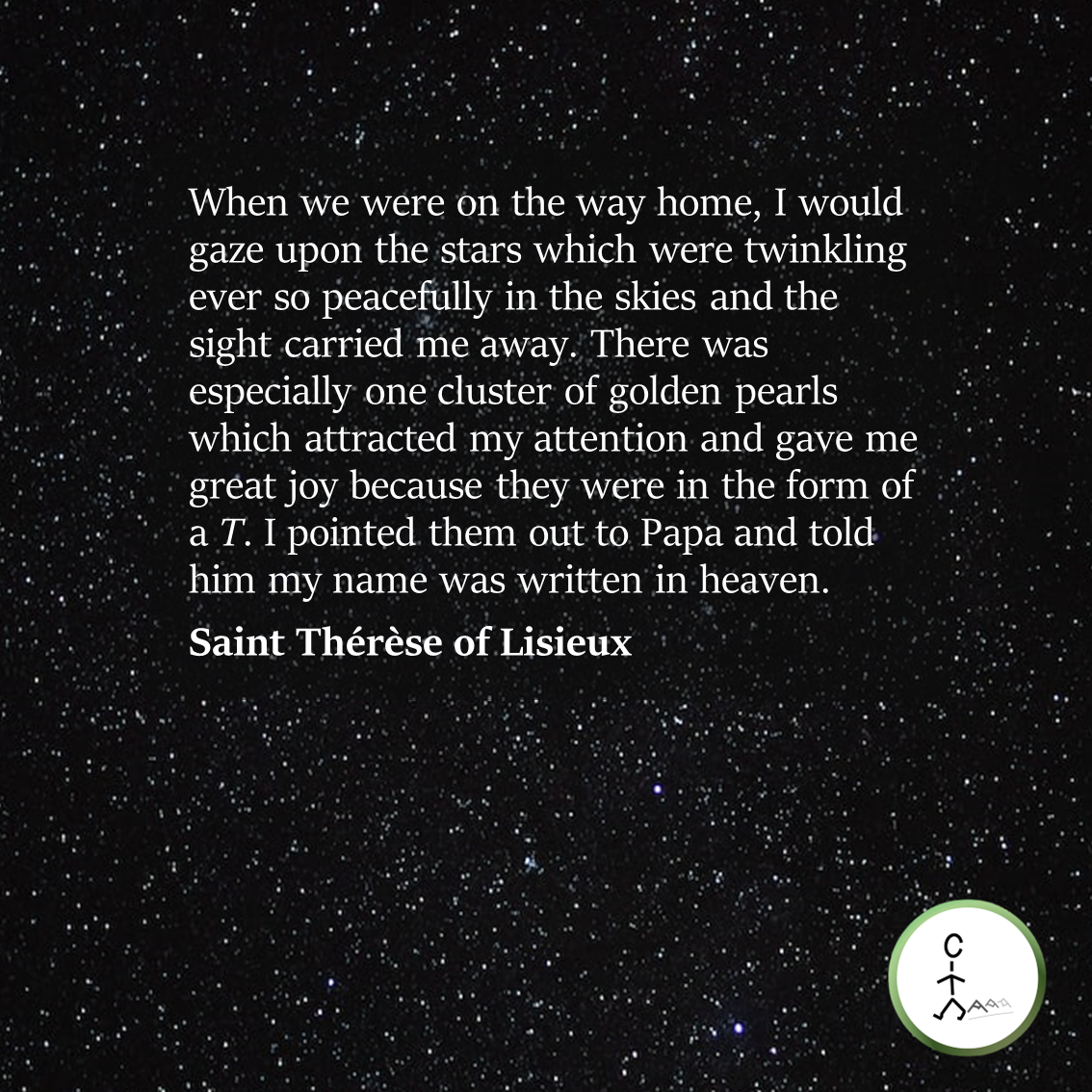 When we were on the way home, I would gaze upon the stars which were twinkling ever so peacefully in the skies and the sight carried me away. There was especially one cluster of golden pearls which attracted my attention and gave me great joy because they were in the form of a T. I pointed them out to Papa and told him my name was written in heaven.