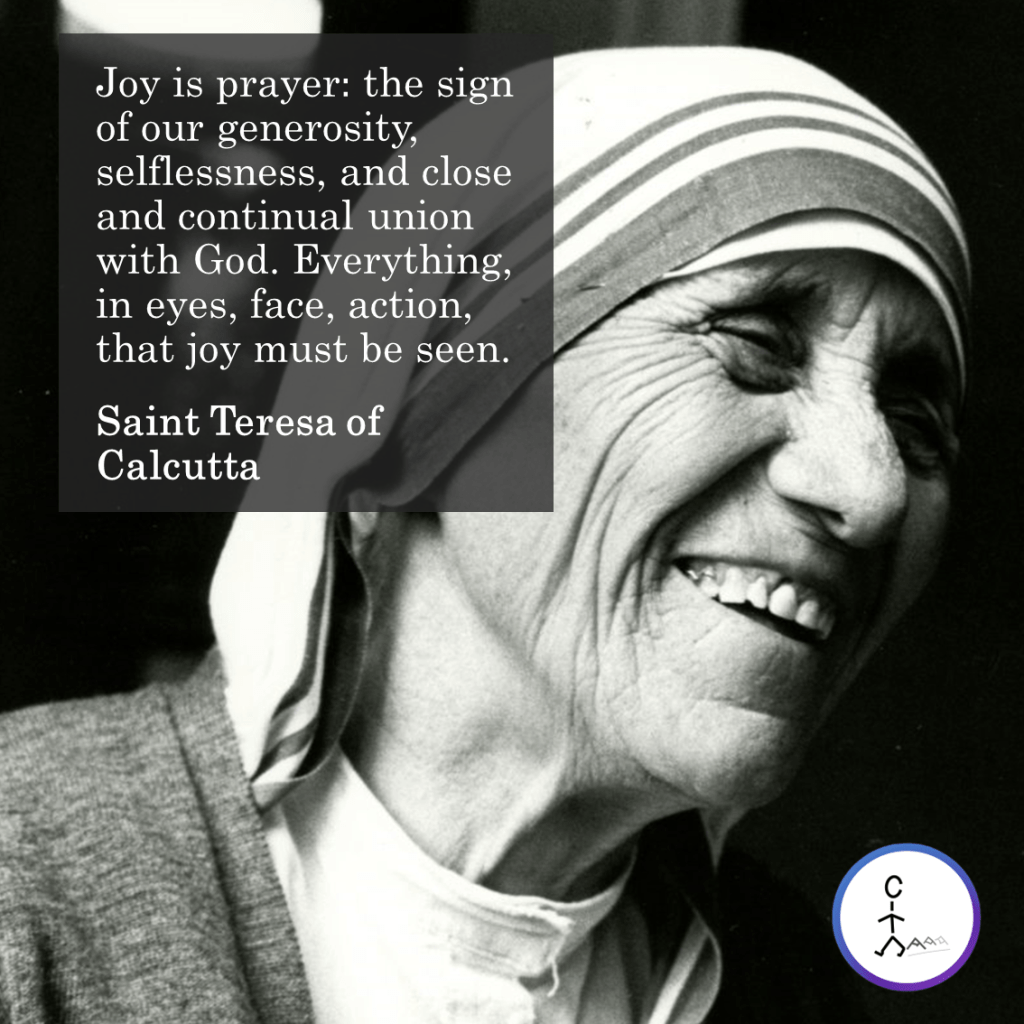 Joy is prayer: the sign of our generosity, selflessness, and close and continual union with God. Everything, in eyes, face, action, that joy must be seen. — Saint Teresa of Calcutta