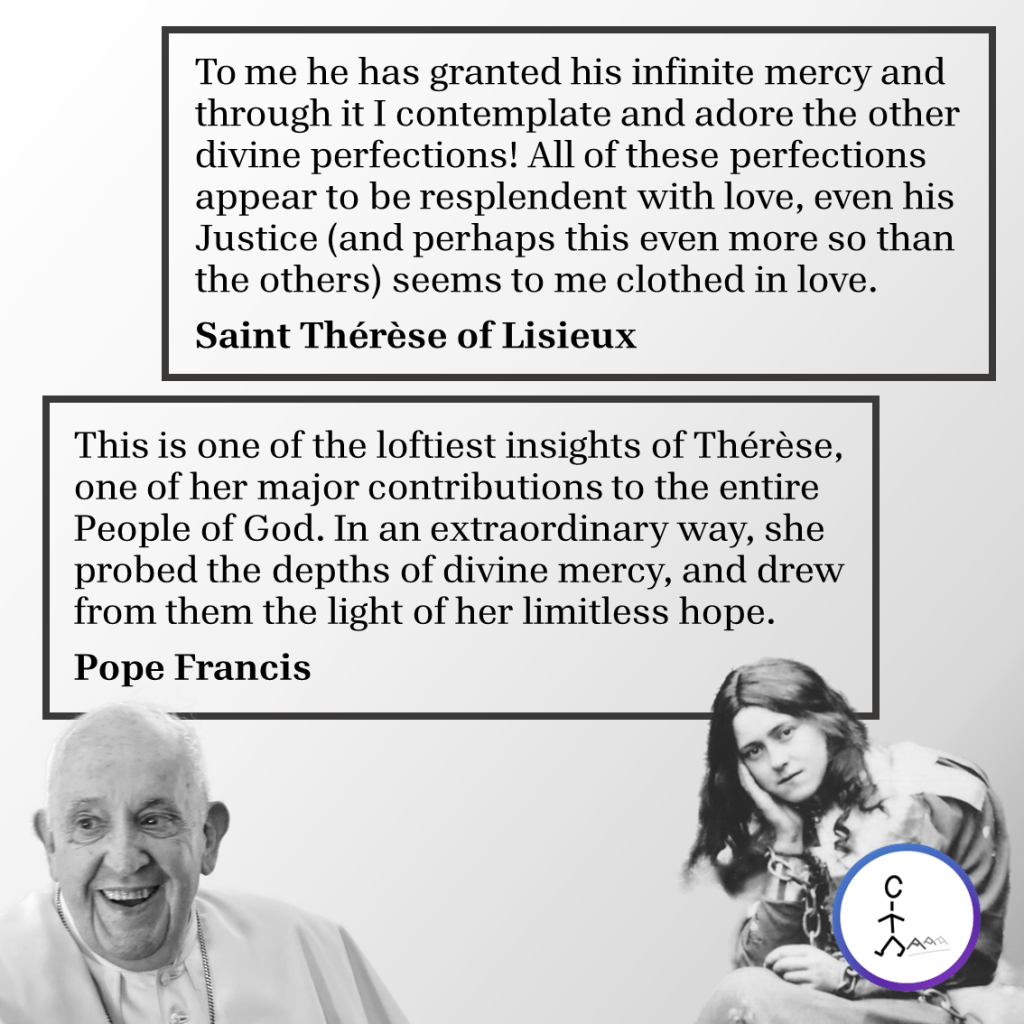 “To me he has granted his infinite mercy and through it I contemplate and adore the other divine perfections! All of these perfections appear to be resplendent with love, even his Justice (and perhaps this even more so than the others) seems to me clothed in love”. This is one of the loftiest insights of Therese, one of her major contributions to the entire People of God. In an extraordinary way, she probed the depths of divine mercy, and drew from them the light of her limitless hope. — Pope Francis, apostolic exhortation C’est la Confiance 27