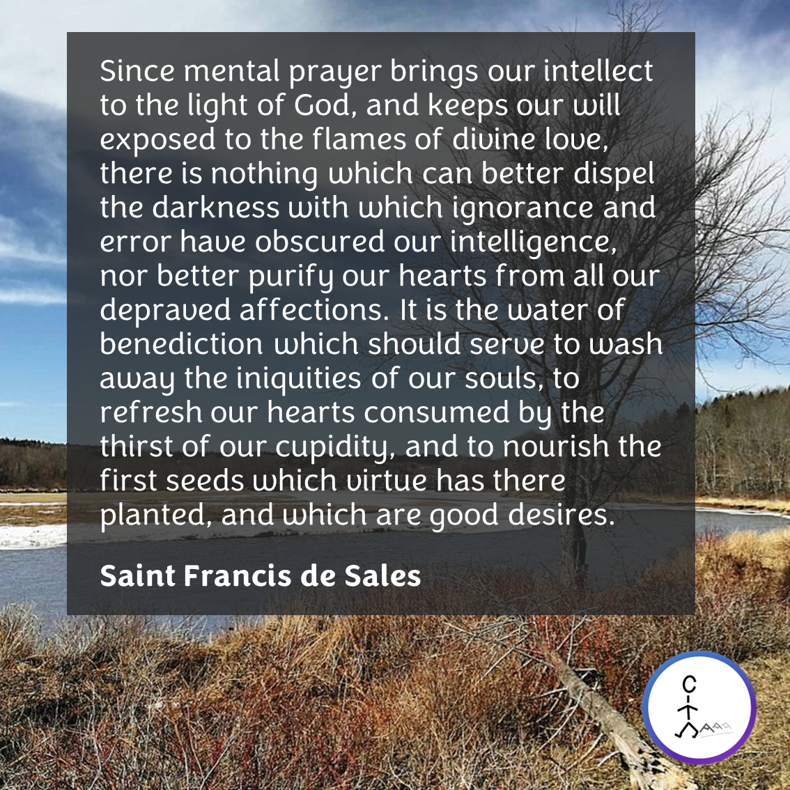 Since mental prayer brings our intellect to the light of God, and keeps our will exposed to the flames of divine love, there is nothing which can better dispel the darkness with which ignorance and error have obscured our intelligence, nor better purify our hearts from all our depraved affections. It is the water of benediction which should serve to wash away the iniquities of our souls, to refresh our hearts consumed by the thirst of our cupidity, and to nourish the first seeds which virtue has there planted, and which are good desires. — Saint Francis de Sales