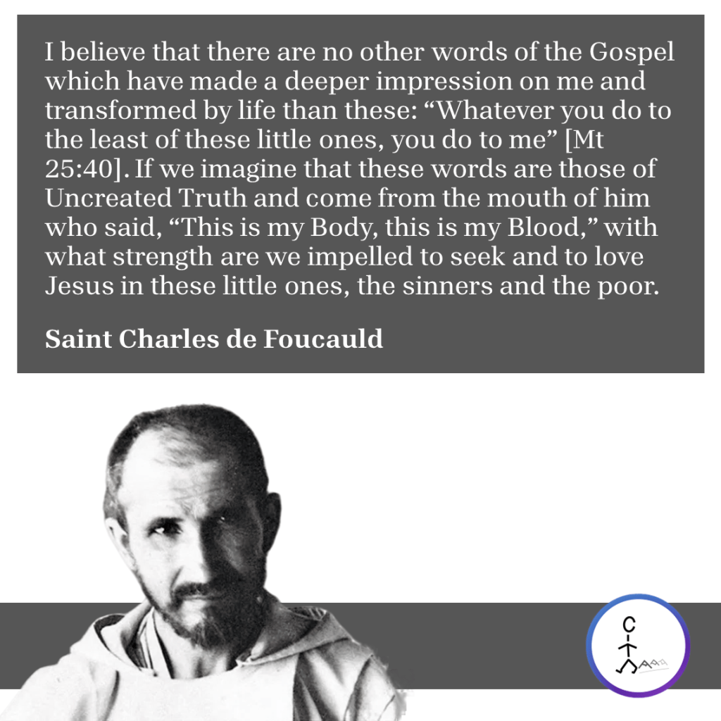 I believe that there are no other words of the Gospel which have made a deeper impression on me and transformed by life than these: “Whatever you do to the least of these little ones, you do to me” [Mt 25:40]. If we imagine that these words are those of Uncreated Truth and come from the mouth of him who said, “This is my Body, this is my Blood,” with what strength are we impelled to seek and to love Jesus in these little ones, the sinners and the poor. — Saint Charles de Foucauld