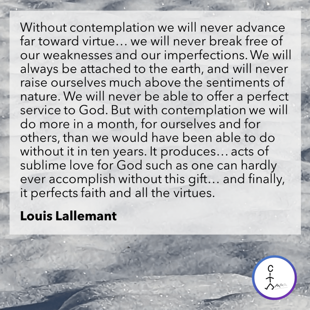 Without contemplation we will never advance far toward virtue… we will never break free of our weaknesses and our imperfections. We will always be attached to the earth, and will never raise ourselves much above the sentiments of nature. We will never be able to offer a perfect service to God. But with contemplation we will do more in a month, for ourselves and for others, than we would have been able to do without it in ten years. It produces… acts of sublime love for God such as one can hardly ever accomplish without this gift… and finally, it perfects faith and all the virtues. — Louis Lallemant
