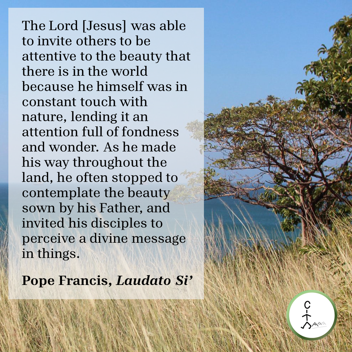 The Lord [Jesus] was able to invite others to be attentive to the beauty that there is in the world because he himself was in constant touch with nature, lending it an attention full of fondness and wonder. As he made his way throughout the land, he often stopped to contemplate the beauty sown by his Father, and invited his disciples to perceive a divine message in things. — Pope Francis, Laudato Si’
