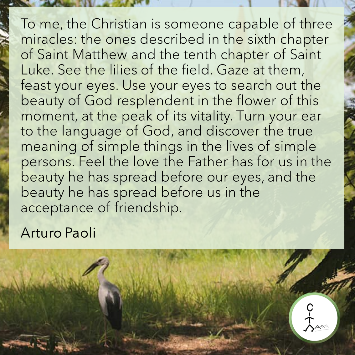To me, the Christian is someone capable of three miracles: the ones described in the sixth chapter of Saint Matthew and the tenth chapter of Saint Luke. See the lilies of the field. Gaze at them, feast your eyes. Use your eyes to search out the beauty of God resplendent in the flower of this moment, at the peak of its vitality. Turn your ear to the language of God, and discover the true meaning of simple things in the lives of simple persons. Feel the love the Father has for us in the beauty he has spread before our eyes, and the beauty he has spread before us in the acceptance of friendship. — Arturo Paoli
