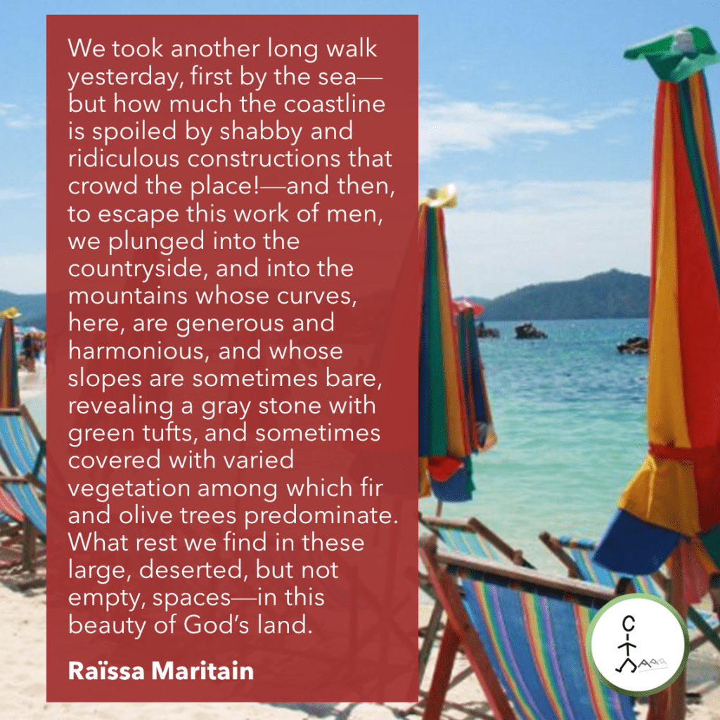 We took another long walk yesterday, first by the sea—but how much the coastline is spoiled by shabby and ridiculous constructions that crowd the place!—and then, to escape this work of men, we plunged into the countryside, and into the mountains whose curves, here, are generous and harmonious, and whose slopes are sometimes bare, revealing a gray stone with green tufts, and sometimes covered with varied vegetation among which fir and olive trees predominate. What rest we find in these large, deserted, but not empty, spaces—in this beauty of God’s land. — Raïssa Maritain