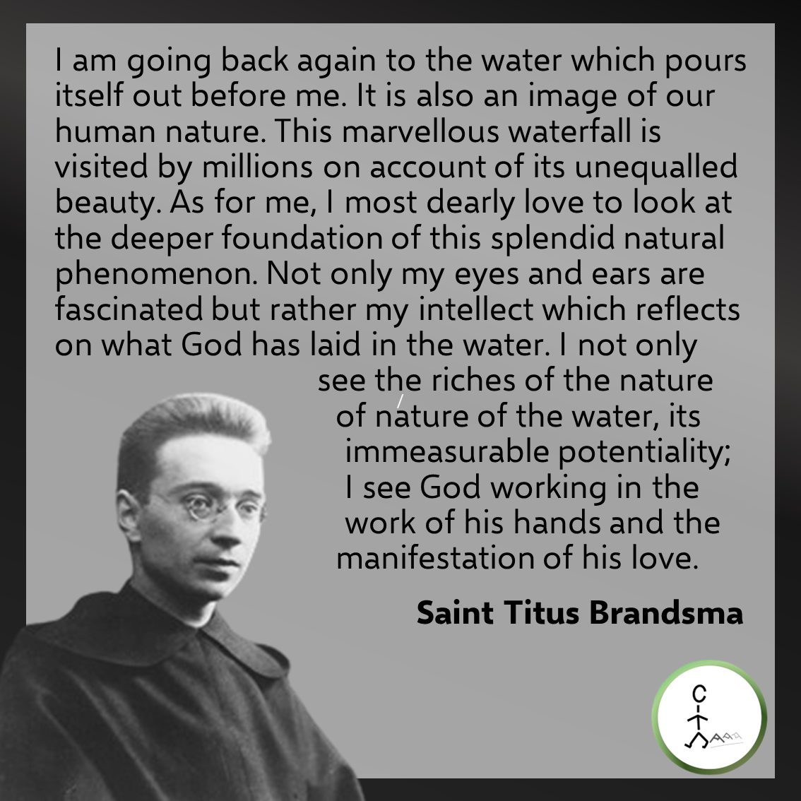 I am going back again to the water which pours itself out before me. It is also an image of our human nature. This marvellous waterfall is visited by millions on account of its unequalled beauty. As for me, I most dearly love to look at the deeper foundation of this splendid natural phenomenon. Not only my eyes and ears are fascinated but rather my intellect which reflects on what God has laid in the water. I not only see the riches of the nature of nature of the water, its immeasurable potentiality; I see God working in the work of his hands and the manifestation of his love. — Saint Titus Brandsma on seeing Niagara Falls