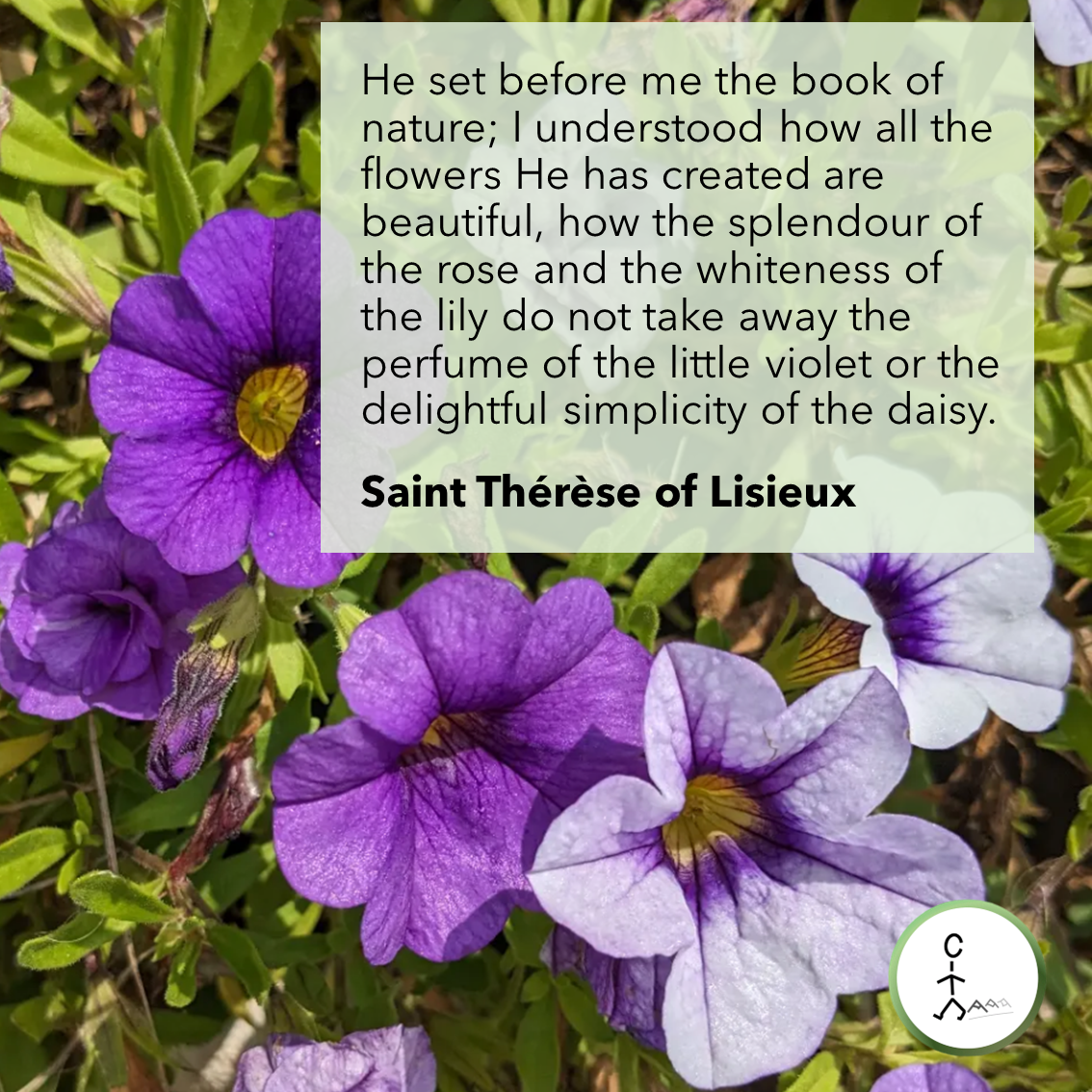 He set before me the book of nature; I understood how all the flowers He has created are beautiful, how the splendour of the rose and the whiteness of the lily do not take away the perfume of the little violet or the delightful simplicity of the daisy. — Saint Thérèse of Lisieux