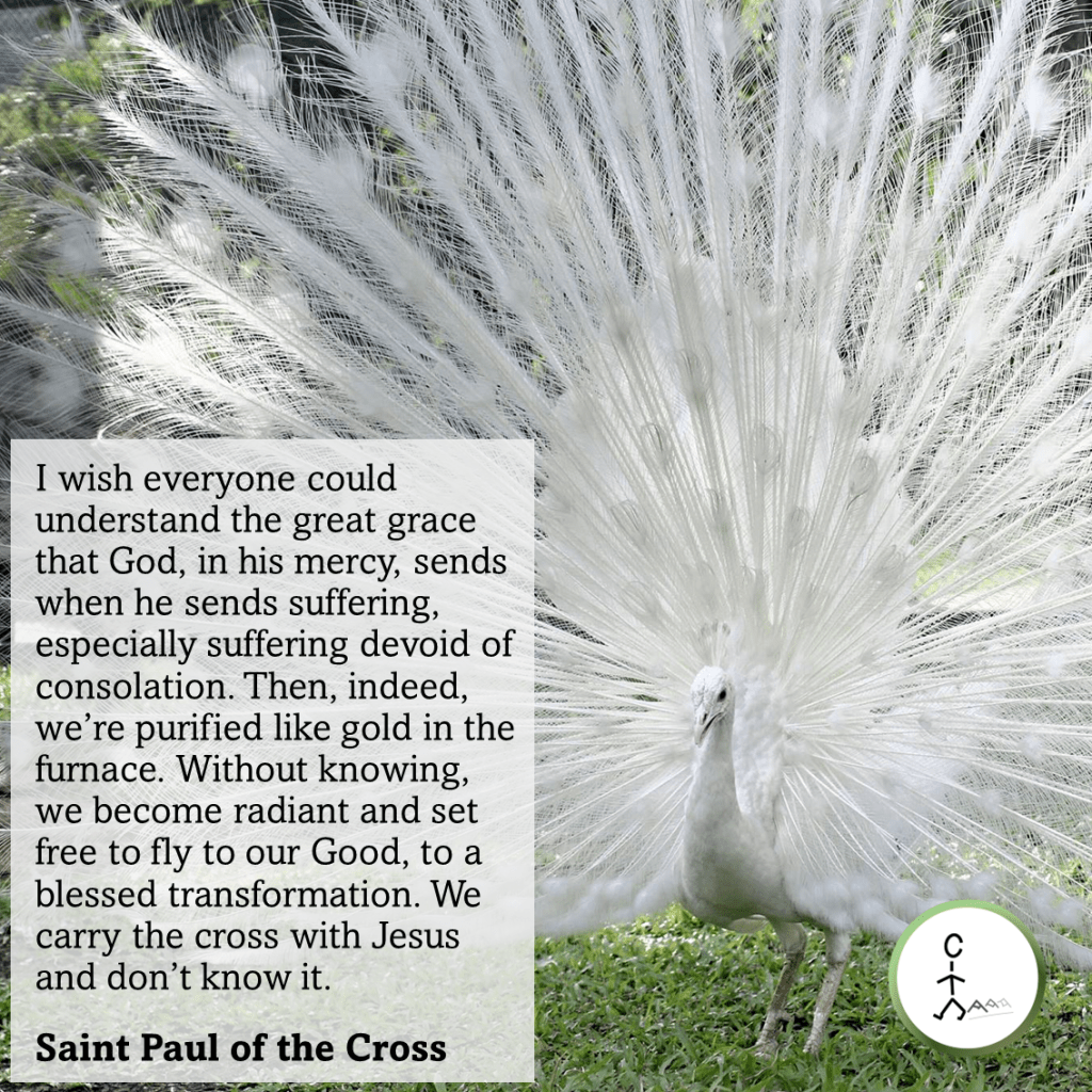 I wish everyone could understand the great grace that God, in his mercy, sends when he sends suffering, especially suffering devoid of consolation. Then, indeed, we’re purified like gold in the furnace. Without knowing, we become radiant and set free to fly to our Good, to a blessed transformation. We carry the cross with Jesus and don’t know it. — Saint Paul of the Cross