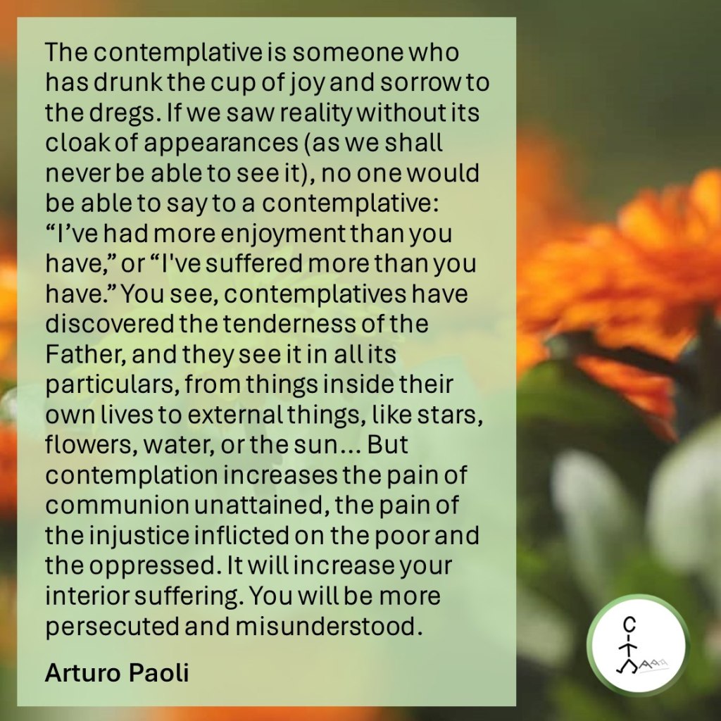 The contemplative is someone who has drunk the cup of joy and sorrow to the dregs. If we saw reality without its cloak of appearances (as we shall never be able to see it), no one would be able to say to a contemplative: ‘I’ve had more enjoyment than you have,’ or ‘I’ve suffered more than you have.’ You see, contemplatives have discovered the tenderness of the Father, and they see it in all its particulars, from things inside their own lives to external things, like stars, flowers, water, or the sun… But contemplation increases the pain of communion unattained, the pain of the injustice inflicted on the poor and the oppressed. It will increase your interior suffering. You will be more persecuted and misunderstood. — Arturo Paoli