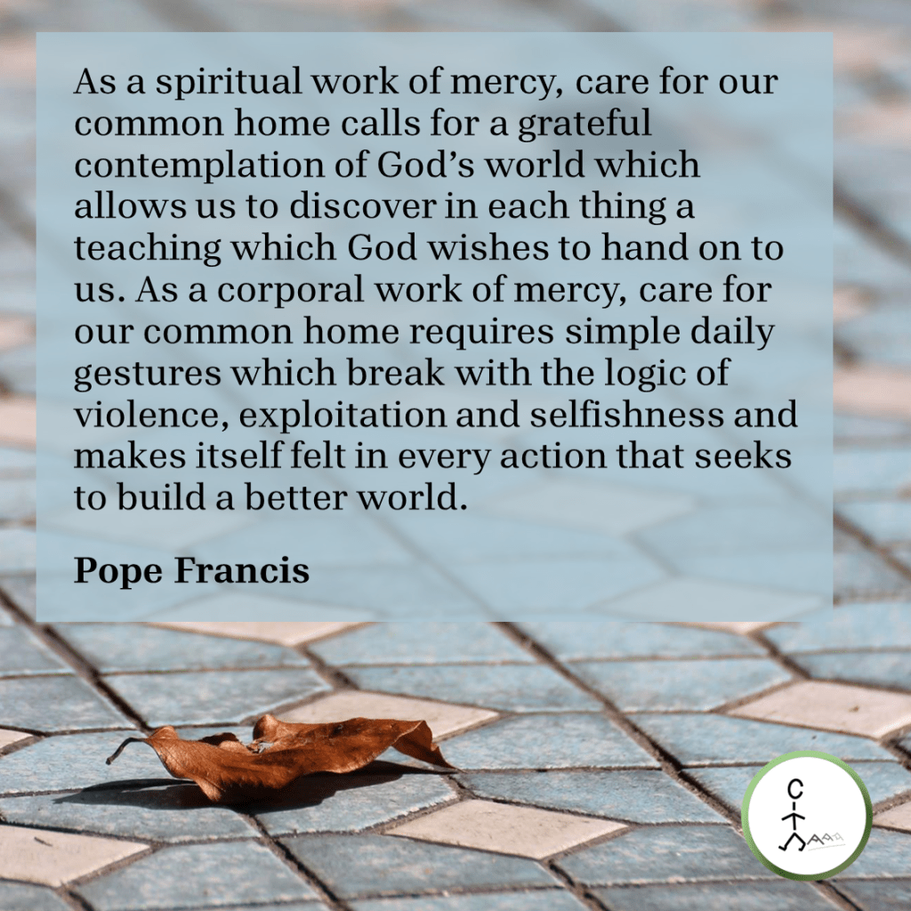 As a spiritual work of mercy, care for our common home calls for a grateful contemplation of God’s world which allows us to discover in each thing a teaching which God wishes to hand on to us. As a corporal work of mercy, care for our common home requires simple daily gestures which break with the logic of violence, exploitation and selfishness and makes itself felt in every action that seeks to build a better world. — Pope Francis