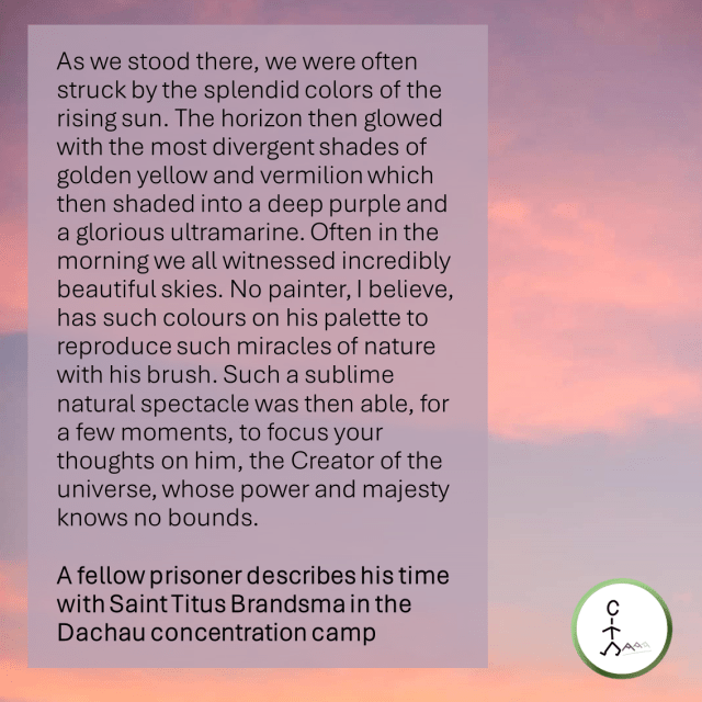 As we stood there, we were often struck by the splendid colors of the rising sun. The horizon then glowed with the most divergent shades of golden yellow and vermilion which then shaded into a deep purple and a glorious ultramarine. Often in the morning we all witnessed incredibly beautiful skies. No painter, I believe, has such colours on his palette to reproduce such miracles of nature with his brush. Such a sublime natural spectacle was then able, for a few moments, to focus your thoughts on him, the Creator of the universe, whose power and majesty knows no bounds. — A fellow prisoner describes his time with Saint Titus Brandsma in the Dachau concentration camp
