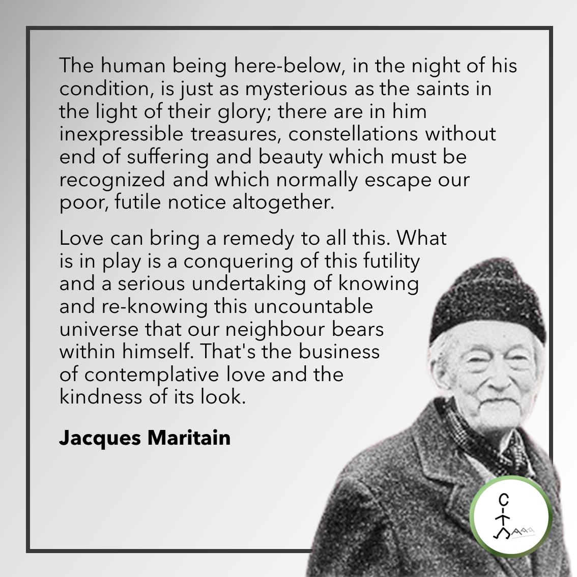 Love can bring a remedy to all this. What is in play is a conquering of this futility and a serious undertaking of knowing and re-knowing this uncountable universe that our neighbour bears within himself. That’s the business of contemplative love and the kindness of its look. — Jacques Maritain