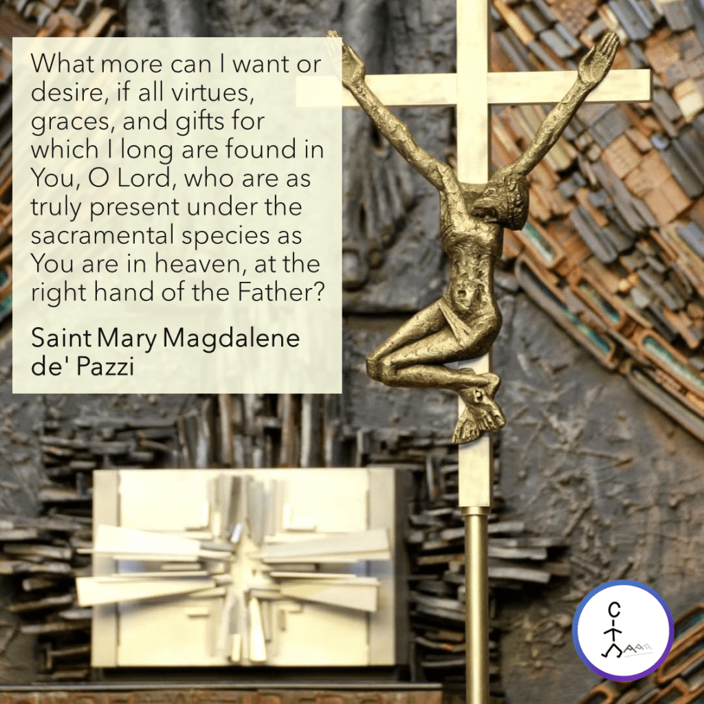 What more can I want or desire, if all virtues, graces, and gifts for which I long are found in You, O Lord, who are as truly present under the sacramental species as You are in heaven, at the right hand of the Father? — Saint Mary Magdalene de’ Pazzi