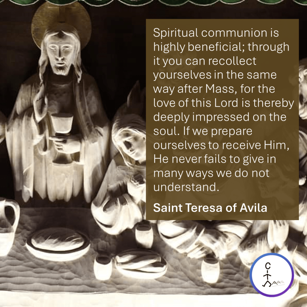 Spiritual communion is highly beneficial; through it you can recollect yourselves in the same way after Mass, for the love of this Lord is thereby deeply impressed on the soul. If we prepare ourselves to receive Him, He never fails to give in many ways we do not understand. — Saint Teresa of Avila