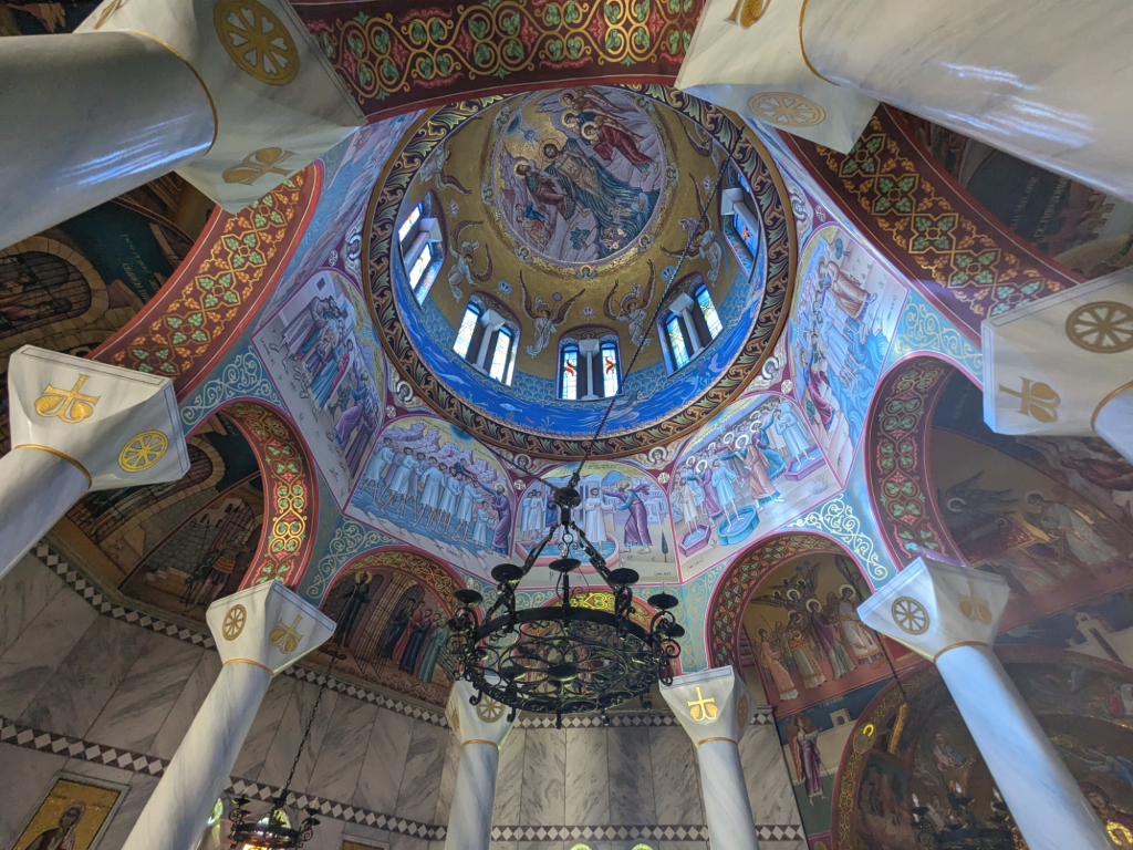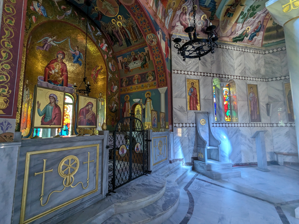 And just a few metres from there, a more substantial construction, used for infant Baptisms by Orthodox Christians, who form the majority in Greece, has been erected. The chapel is dedicated to Saint Lydia, and gorgeous murals surrounding the central Baptistery font tell the story of Saint Paul in Philippi, not neglecting the contributions of his hospitable co-worker Lydia.
