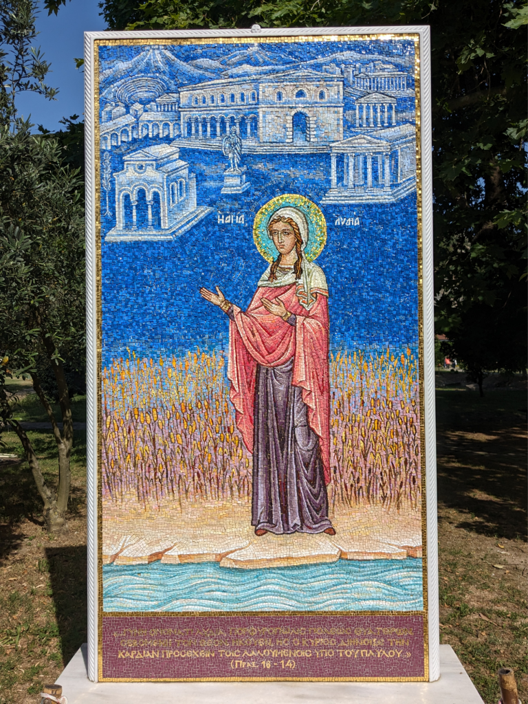 All around the site, too, one can find various iconographical representations of Lydia. Media vary: stained glass, mosaic tile, paint. Locations range: behind the main altar, as a simple iconostasis, in the portico of the chapel, outside the chapel, at the river site. All are—I imagine this comes as no surprise by now—dear to my heart.