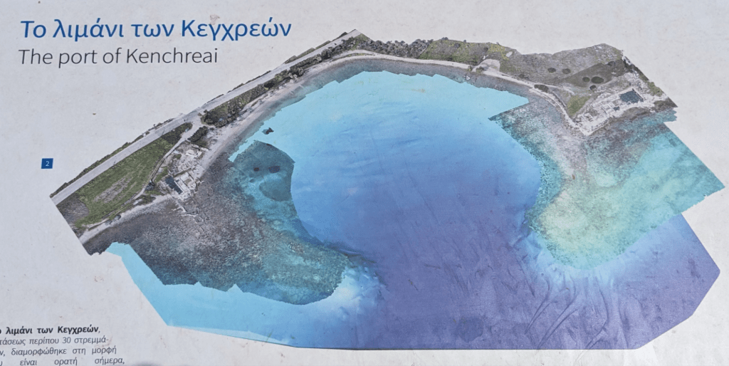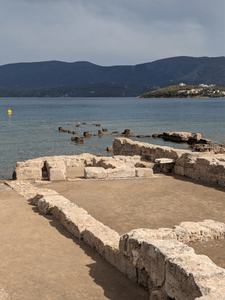 So I went to Cenchreae. It’s underwater now. The buildings along the ancient port sank. Some yellow buoys denote the extent of the moles. But you can further see the outlines of some structures from the shore (or if one goes snorkelling, which I came very much unprepared for). The surrounding beach is frequented by locals. Further archaeological remains from later eras line the shore. Entrance is free, since all beaches in Greece are by law public.